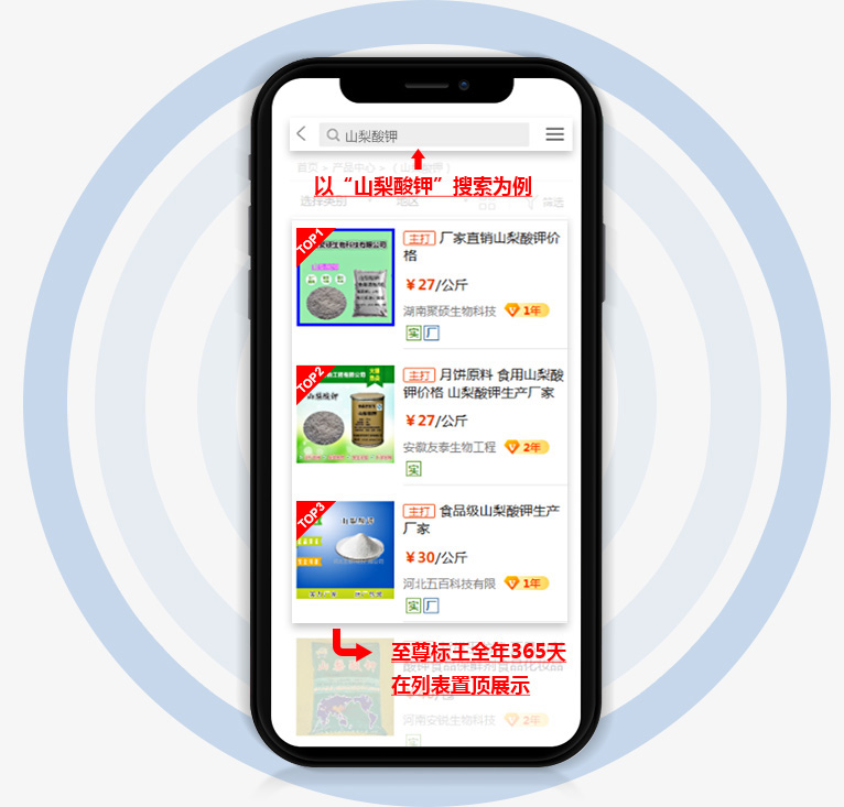 如購買關鍵詞,用戶通過關鍵詞搜索時,標王產品即置頂出現,只能匹配,絕對超值。